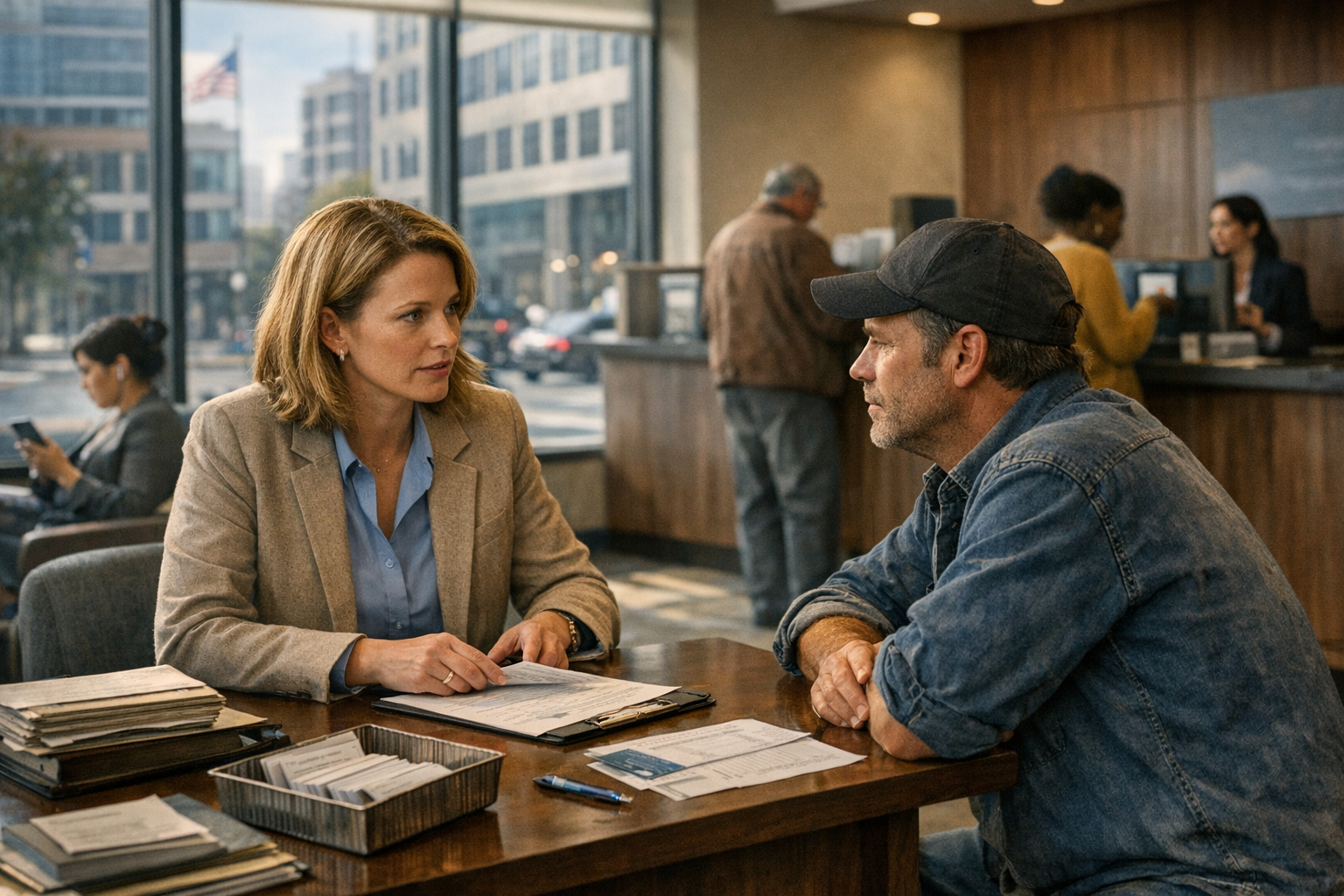 Regional bank manager speaking with a small-business customer inside a modern branch